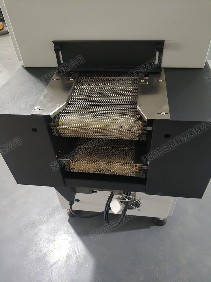 UV固化机采用韩国LG双组LED光源,主波峰为365nm,搭配水冷散热系统,确保长时间高效稳定运行。设备配备人机界面触摸屏,支持手动调节灯组高度(50mm入口设计)及输送速度(0-5m/min),适配不同生产需求。输送系统采用不锈钢穿轴网带,双通道设计(上层左→右,下层右→左),输送宽度可微调至172mm,适用于电子封装、光学镜片、医疗检测、三防漆涂覆等高精度场景。结合双通道UV固化技术,可快速完成胶水、油墨、光油等材料的精准固化,兼具环保性与工业级可靠性。